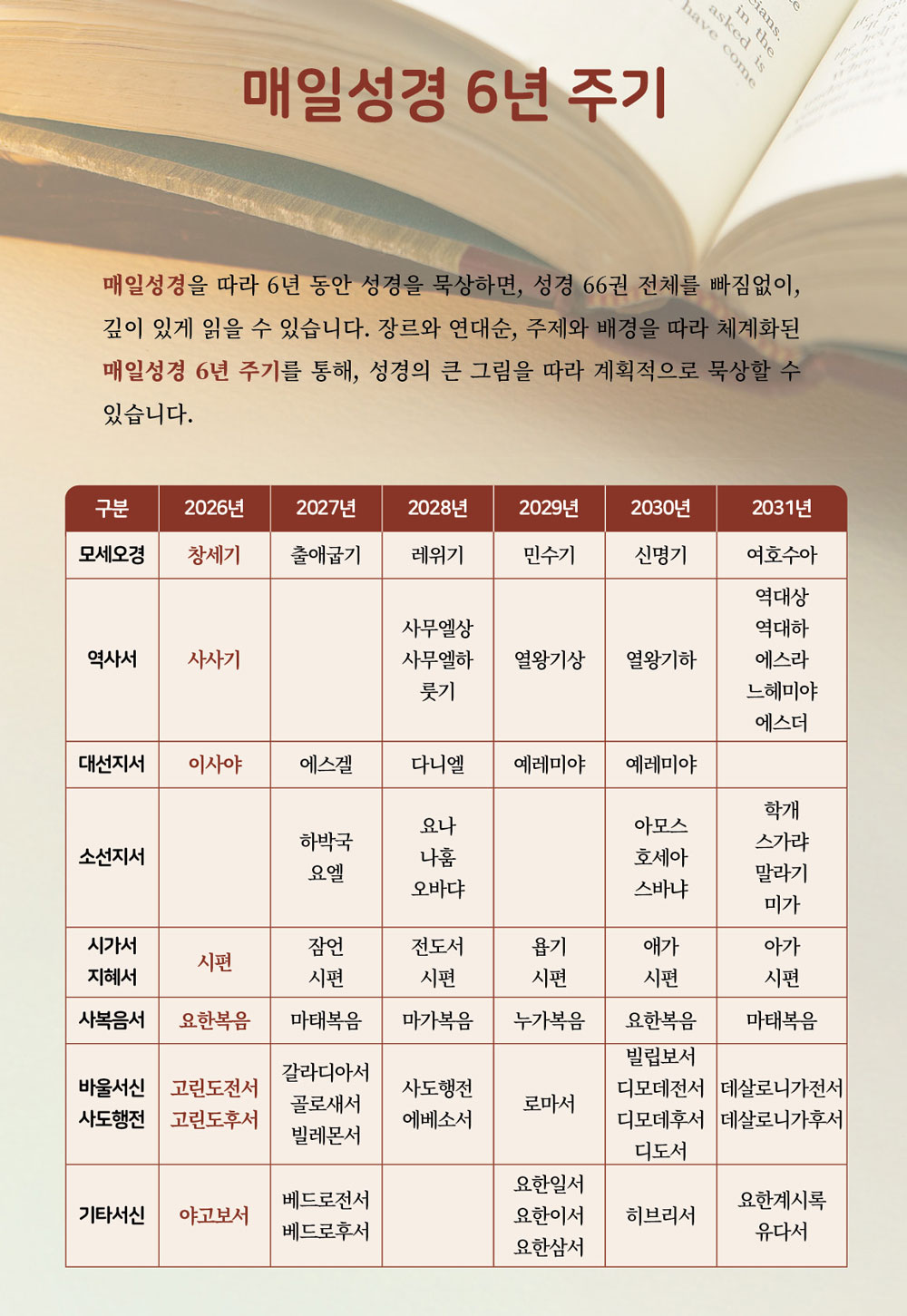 ‘성경에 대해서’가 아니라 매일 ‘성경을’ 읽고 묵상하며 나눔을 통해 신앙과 삶이 일치되도록 합니다.